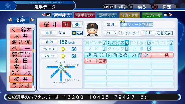 の4球種で基本を組み立て、球速の遅いサクライダーは封印。ここぞの場面で切り札の直球に近いスピードから落ちるスプリット「サクラスプリット」 を繰り出すピッチングで巨人のローテーションを掴み取った。